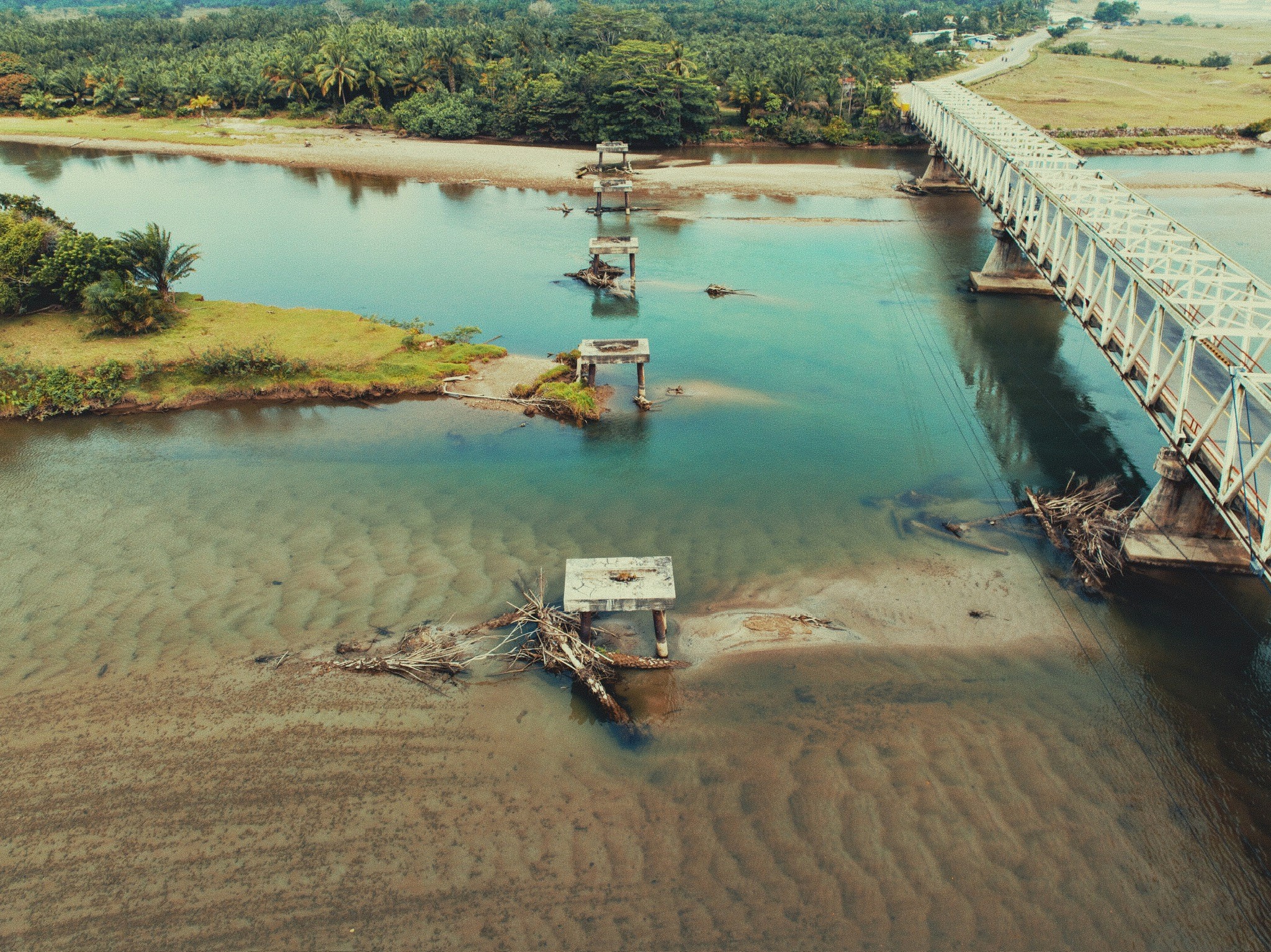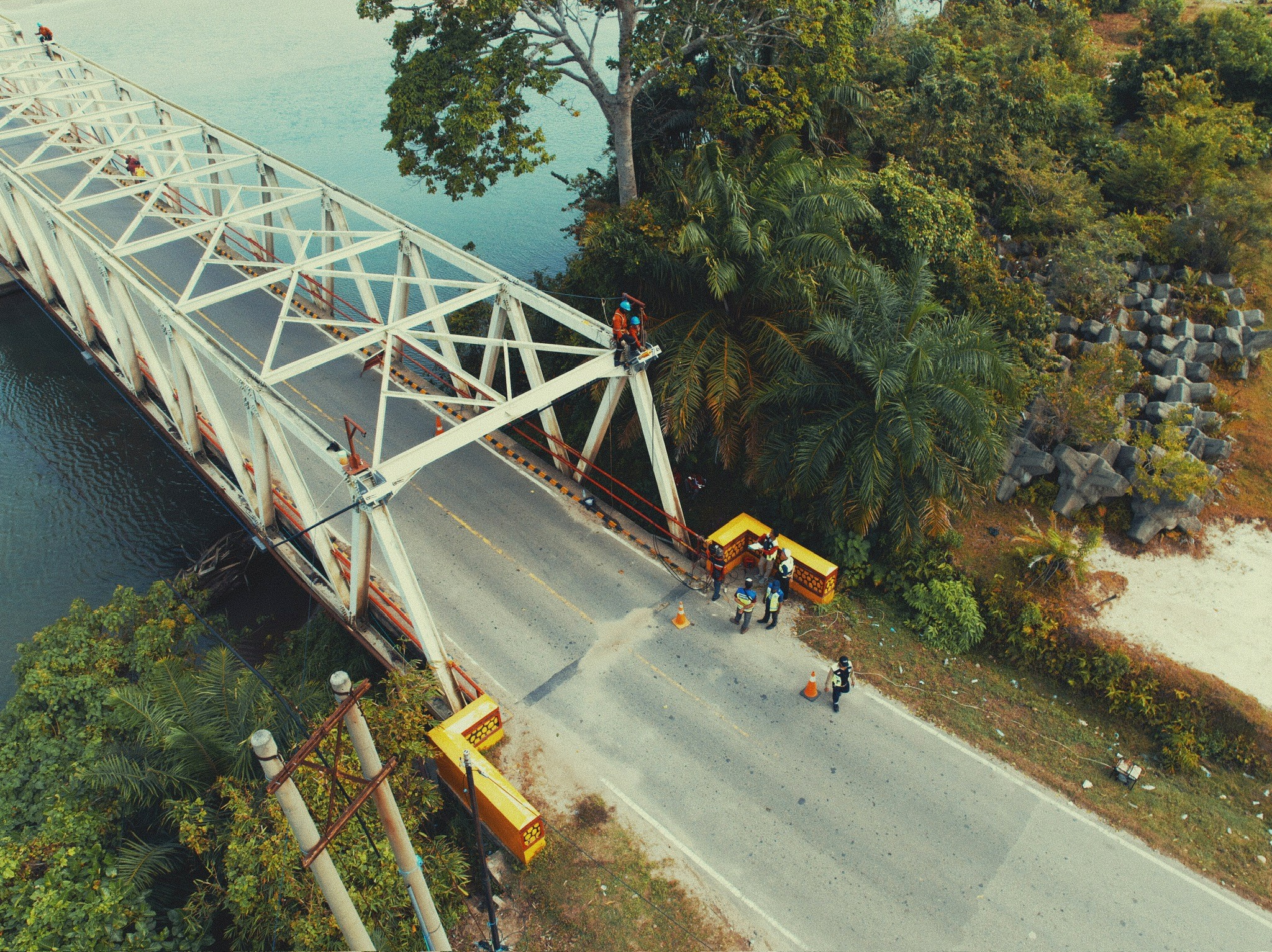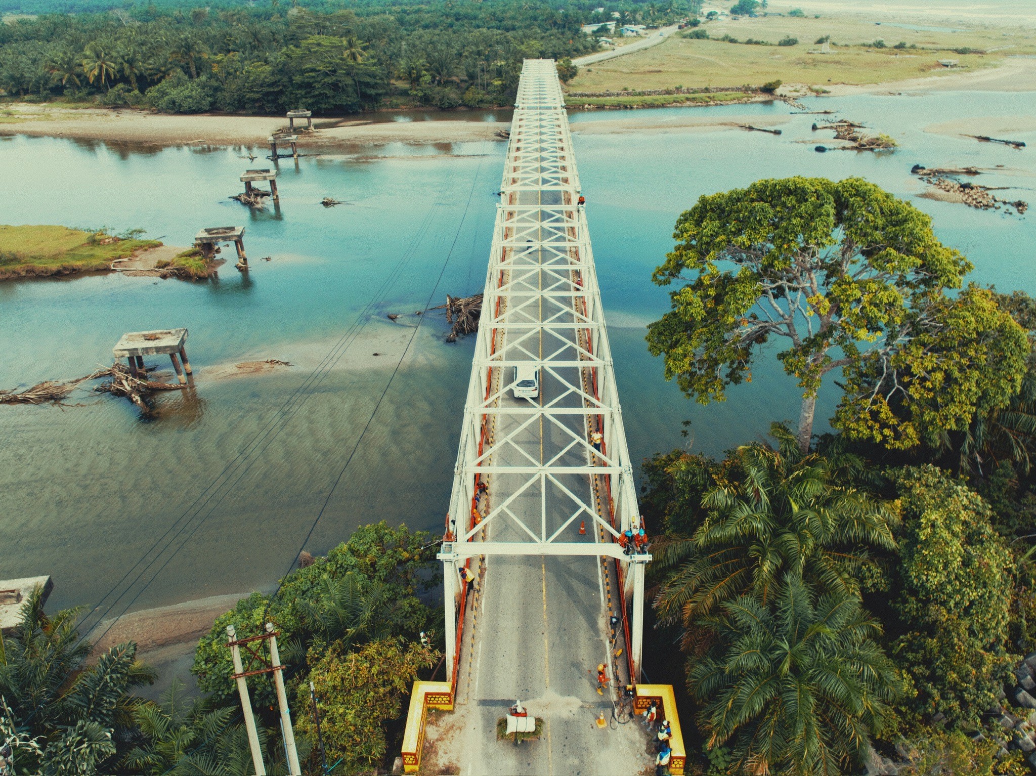 • Drone mengambil panoramic shot yang menampilkan jembatan setelah selesai direhabilitasi.